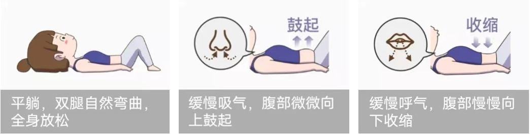平躺保持全身放松,先慢慢地用鼻子吸气,鼓起肚子;然后用嘴巴慢慢地呼气,让肚子凹下去,多次重复。